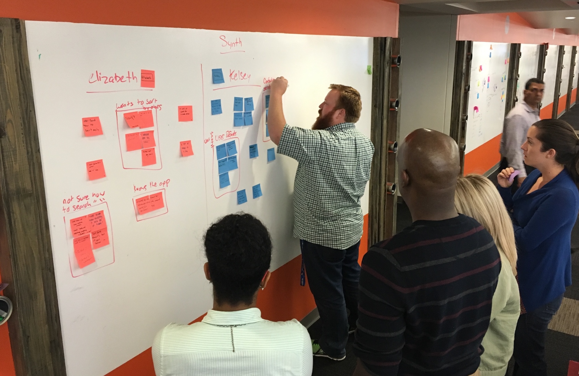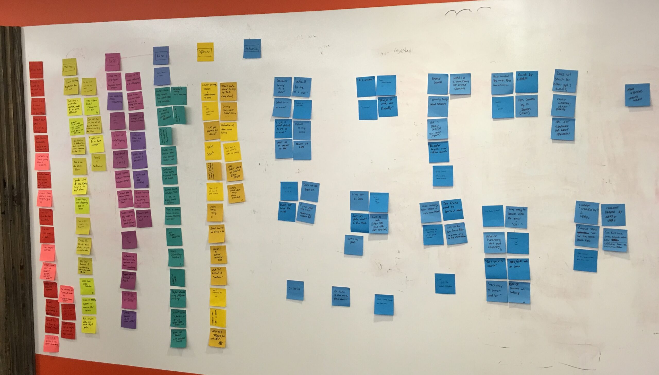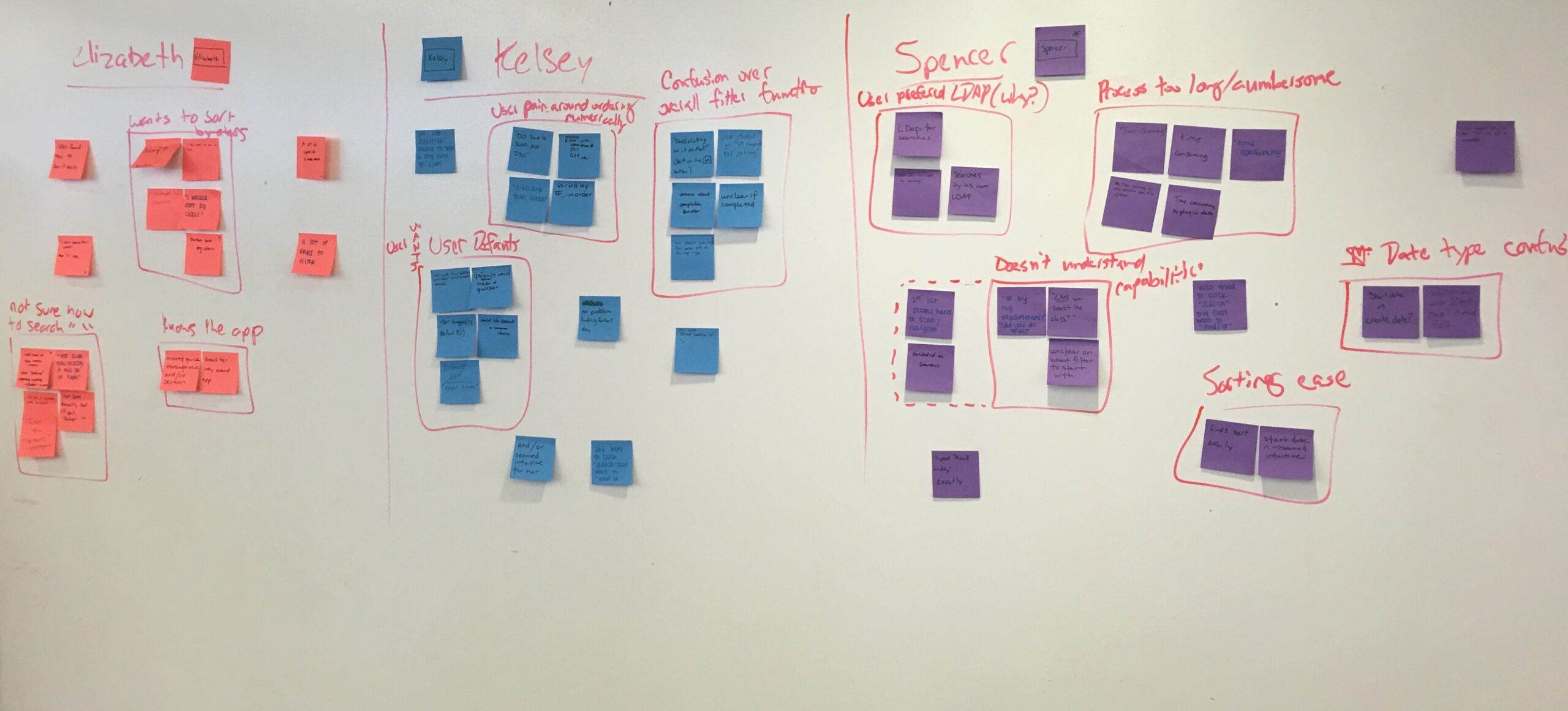 - Phase 3 – After all of the sticky notes were written up, we grouped all of the overlap in issues seen across multiple users so that a heat map was shown of common issues and wrote them up on the white board.